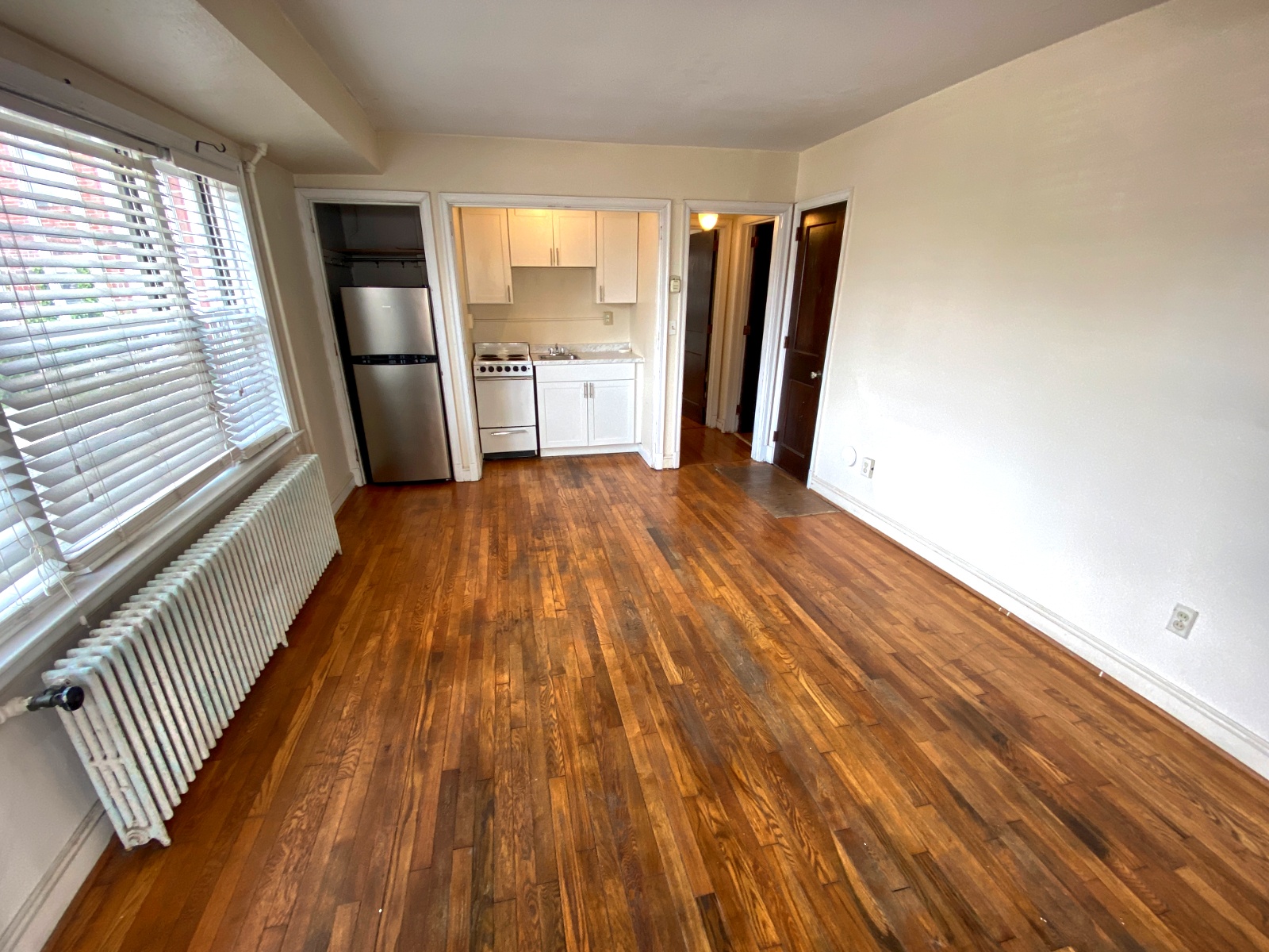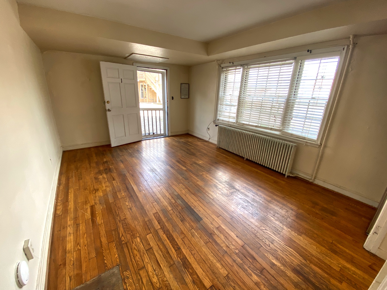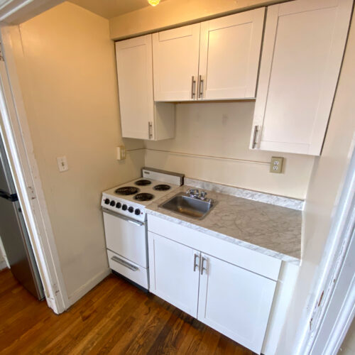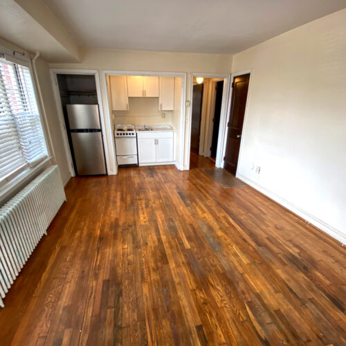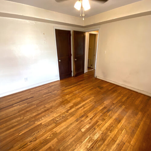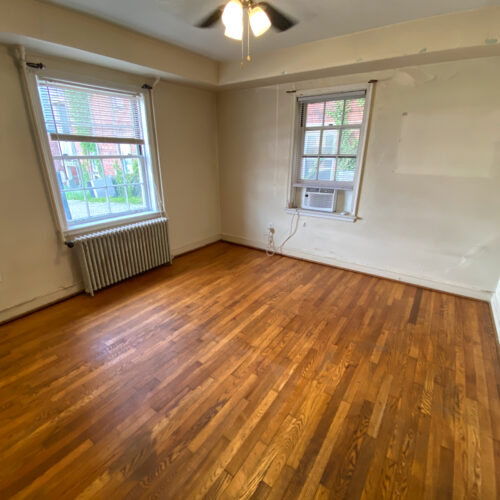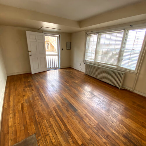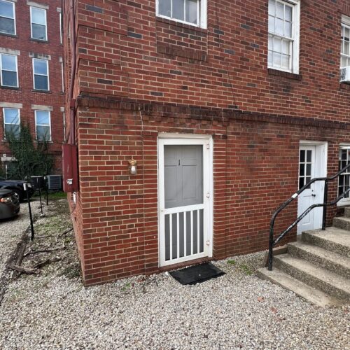 This apartment features hardwood floors, tall ceilings, a bottom-level layout, and a shared laundry room that is located right across the driveway in 26 N Congress St.