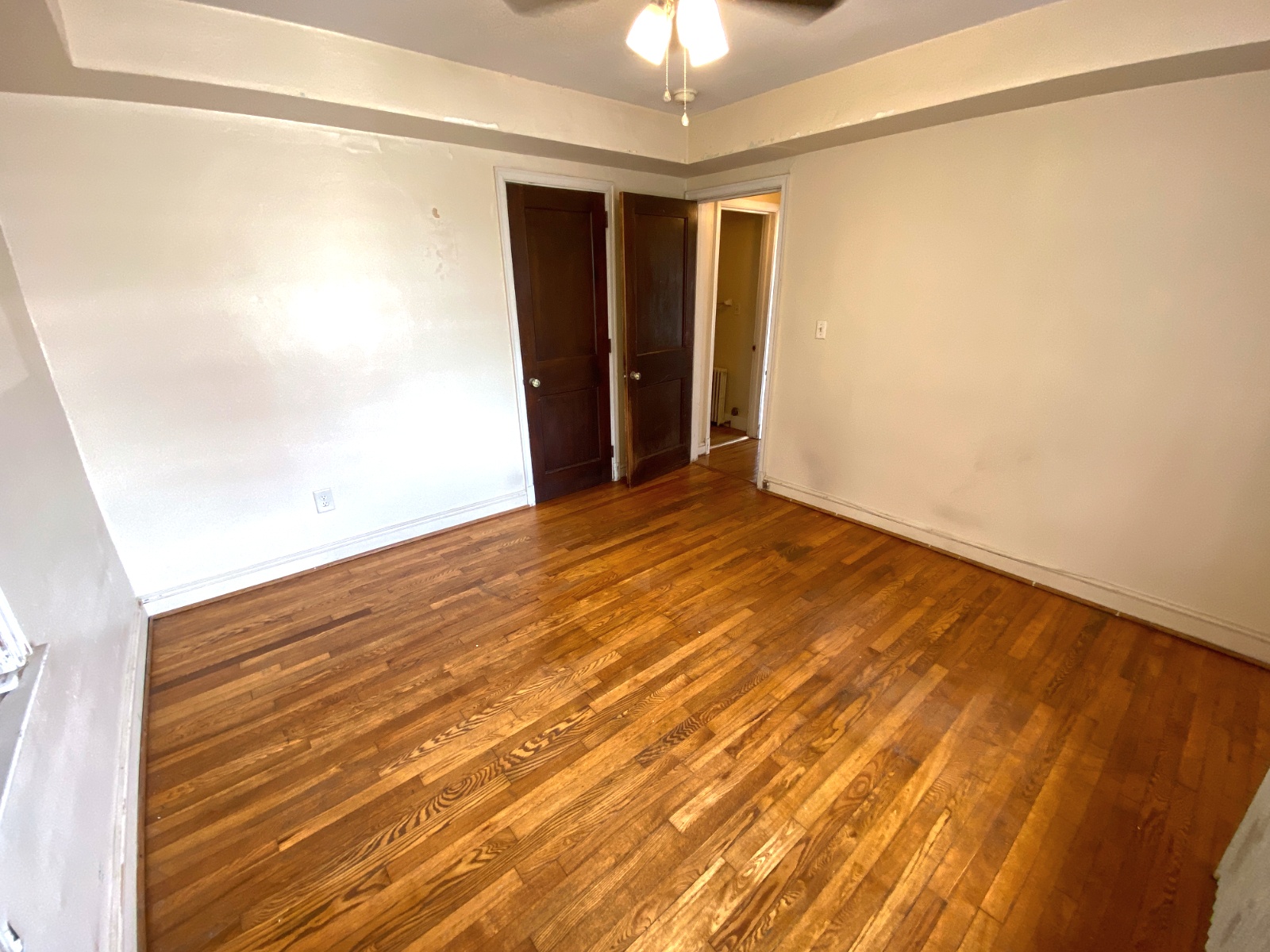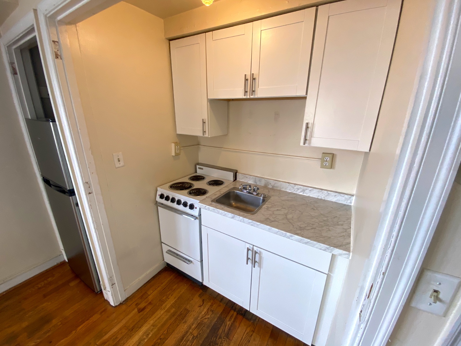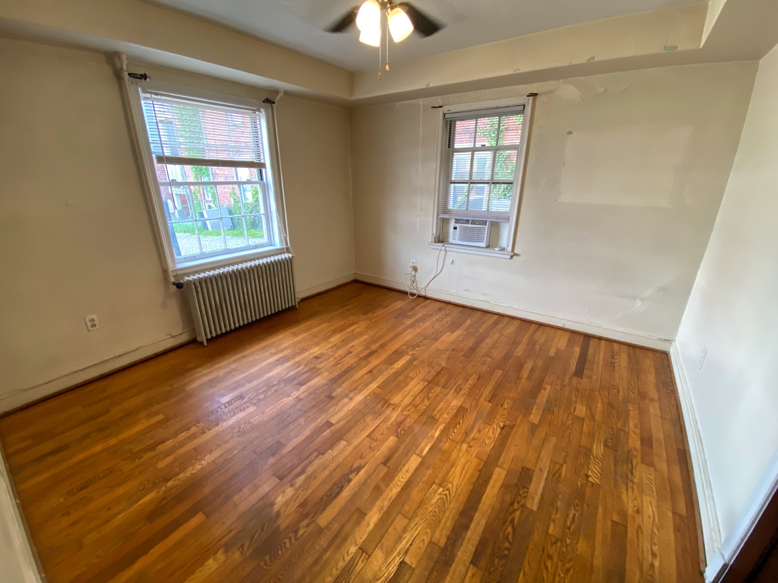 This apartment features hardwood floors, tall ceilings, a bottom-level layout, and a shared laundry room that is located right across the driveway in 26 N Congress St.